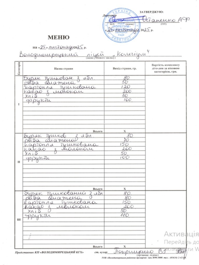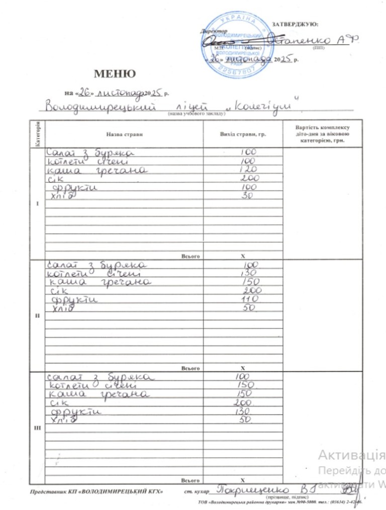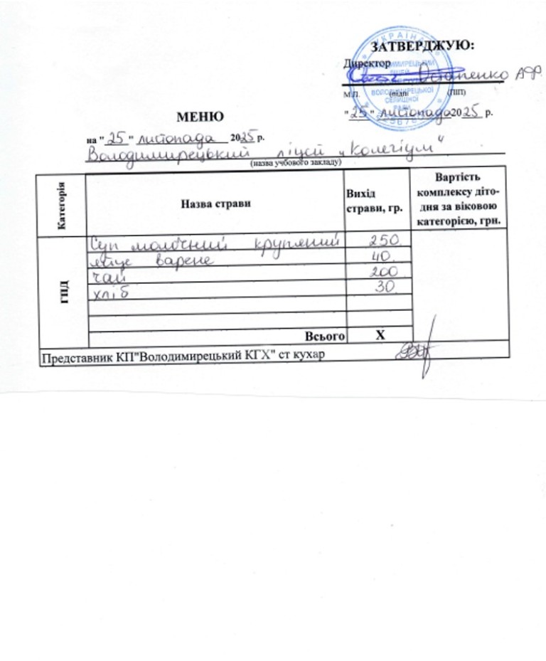 Меню на 25.11.2025 року
