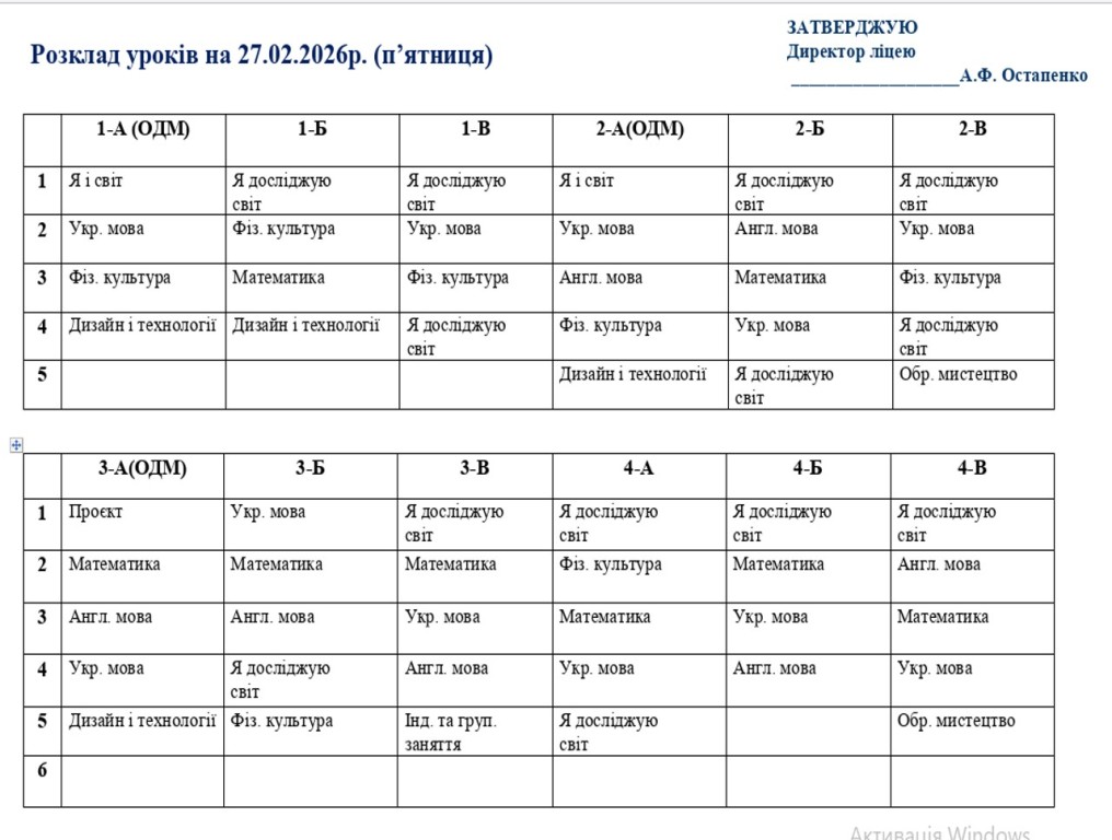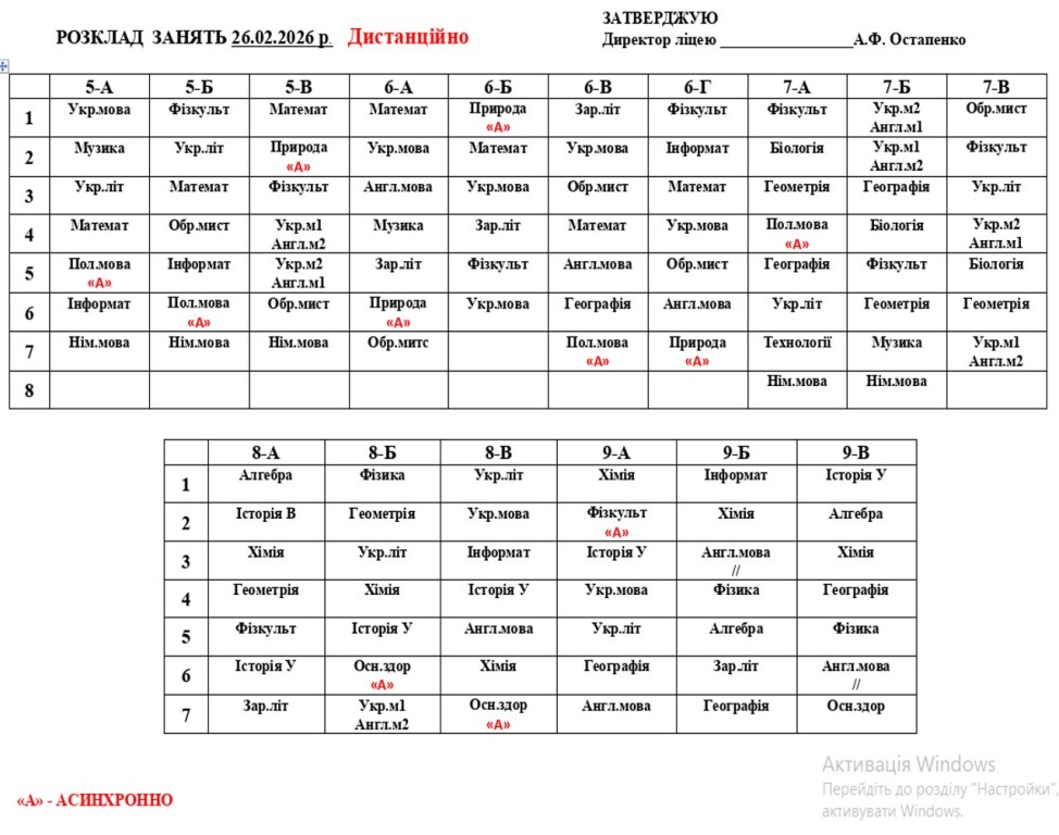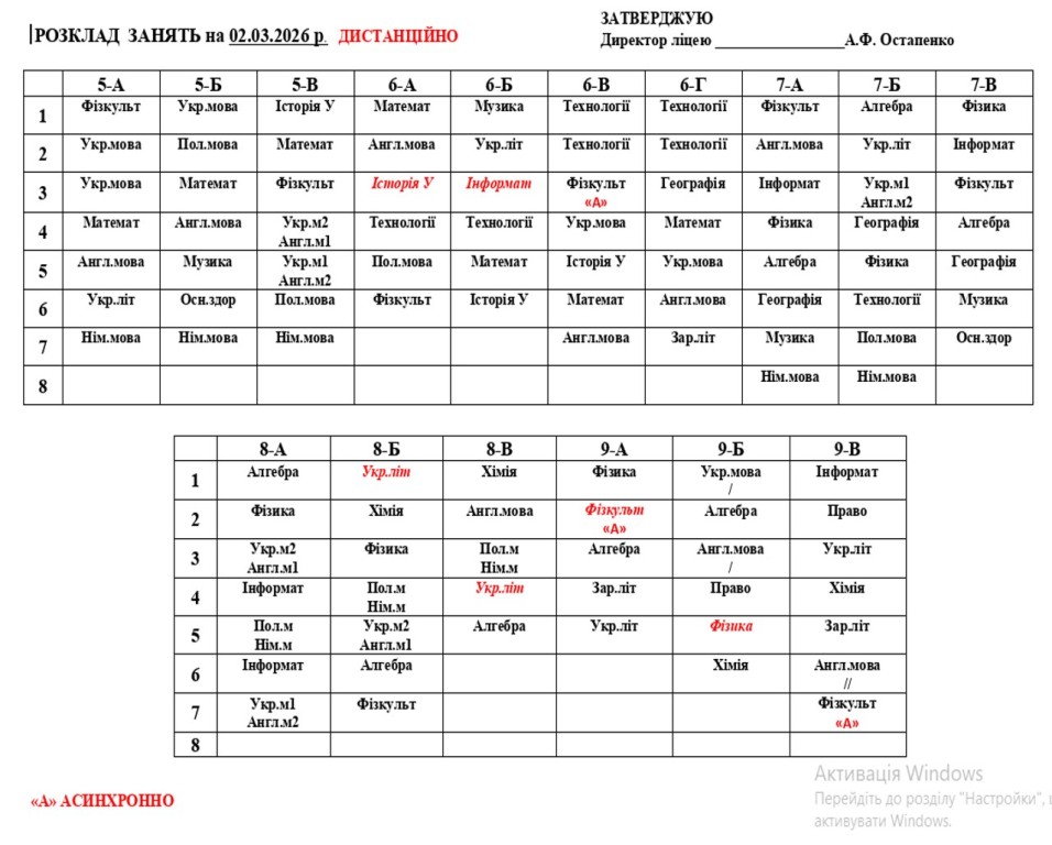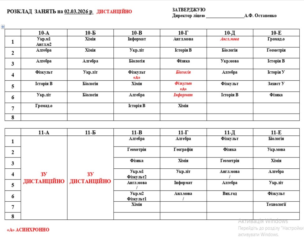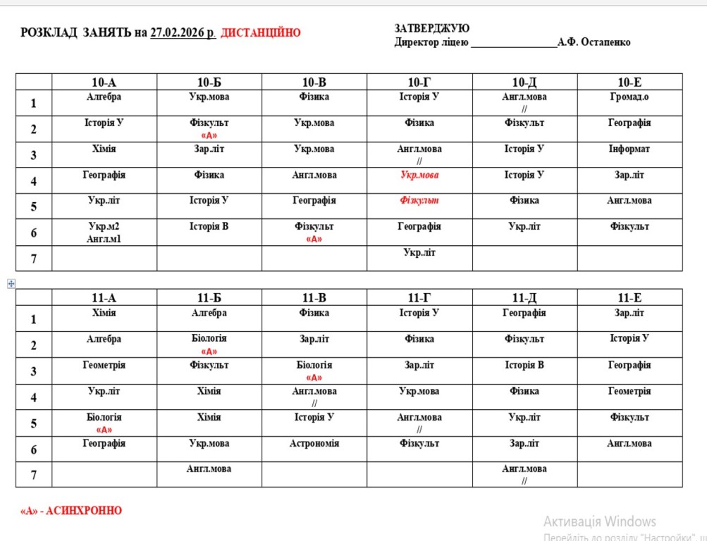 У зв’язку з перевищенням порогу захворюваності учасників освітнього процесу на ГРВІ - 27%, 02 березня 2026 року освітній процес у ліцеї буде організовано в дистанційному форматі відповідно до розкладу занять. Відновлення очного навчання відбудеться після стабілізації епідеміологічної ситуації та зменшення кількості хворих. Про дату повернення до навчання в очному режимі буде повідомлено додатково. Просимо батьків звернути увагу на стан здоров’я дітей та дотримання профілактичних заходів. Дякуємо за розуміння та співпрацю!
