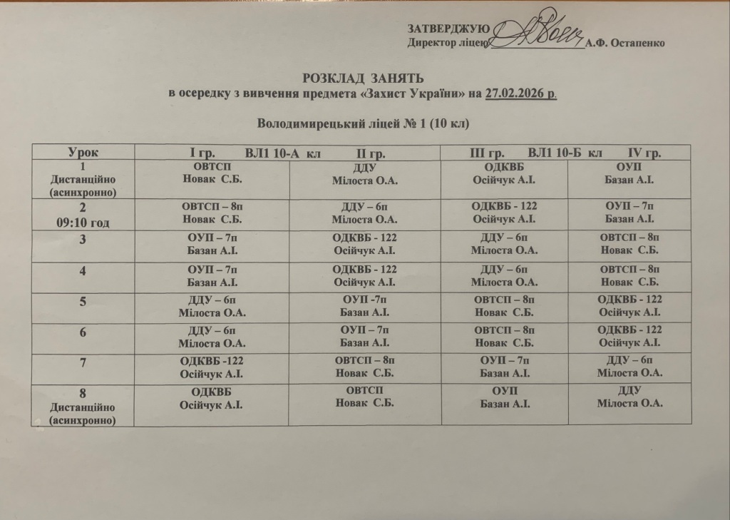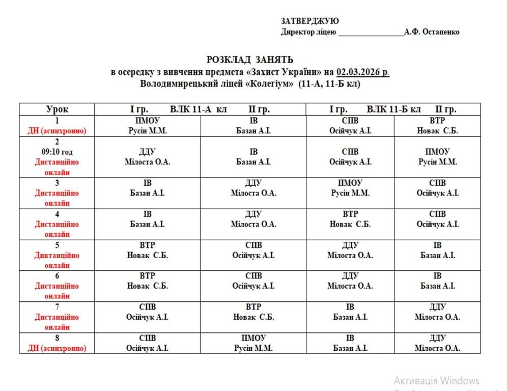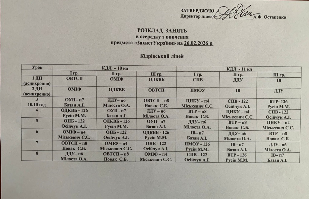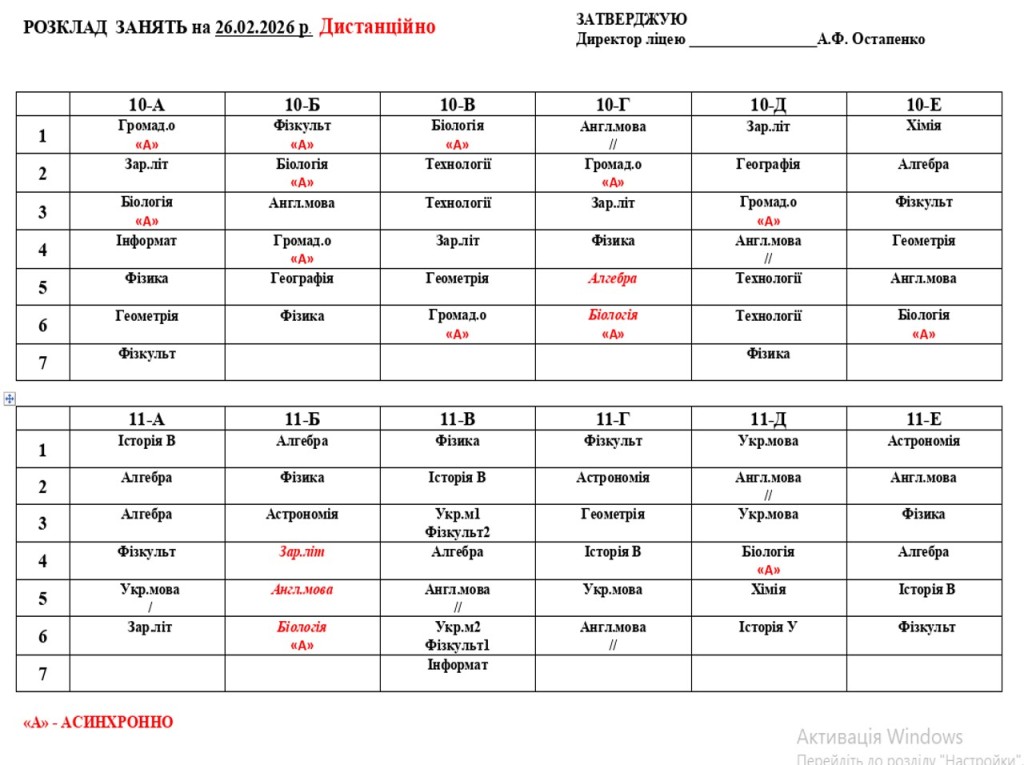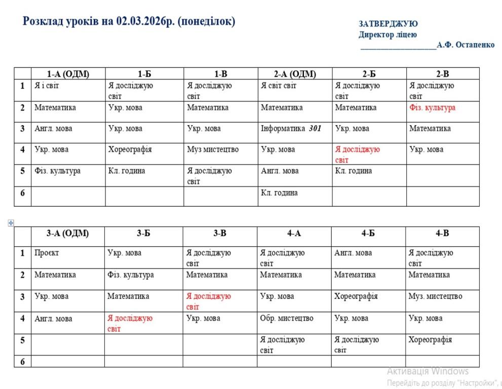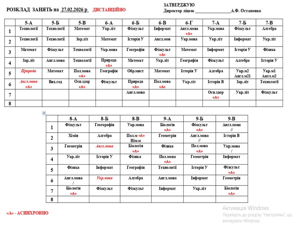 У зв’язку з перевищенням порогу захворюваності учасників освітнього процесу на ГРВІ - 27%, 02 березня 2026 року освітній процес у ліцеї буде організовано в дистанційному форматі відповідно до розкладу занять. Відновлення очного навчання відбудеться після стабілізації епідеміологічної ситуації та зменшення кількості хворих. Про дату повернення до навчання в очному режимі буде повідомлено додатково. Просимо батьків звернути увагу на стан здоров’я дітей та дотримання профілактичних заходів. Дякуємо за розуміння та співпрацю!