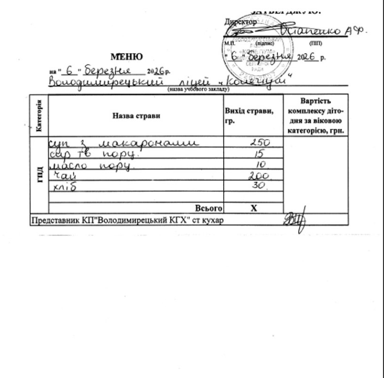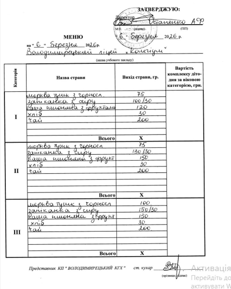 Меню на 06.03.2026 року