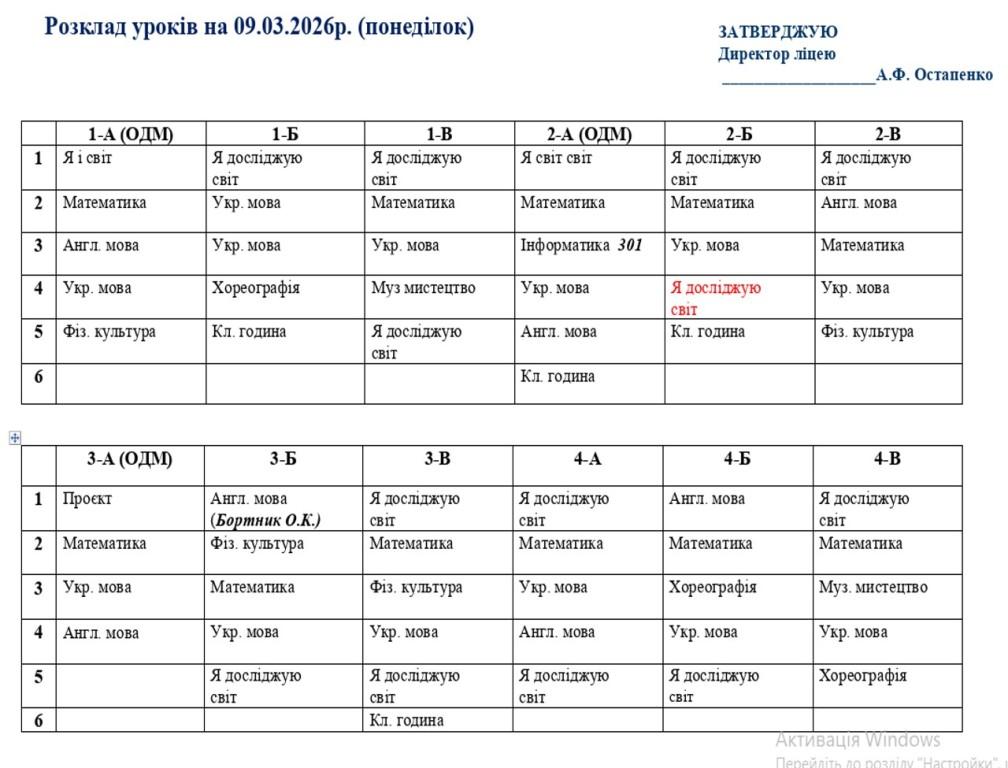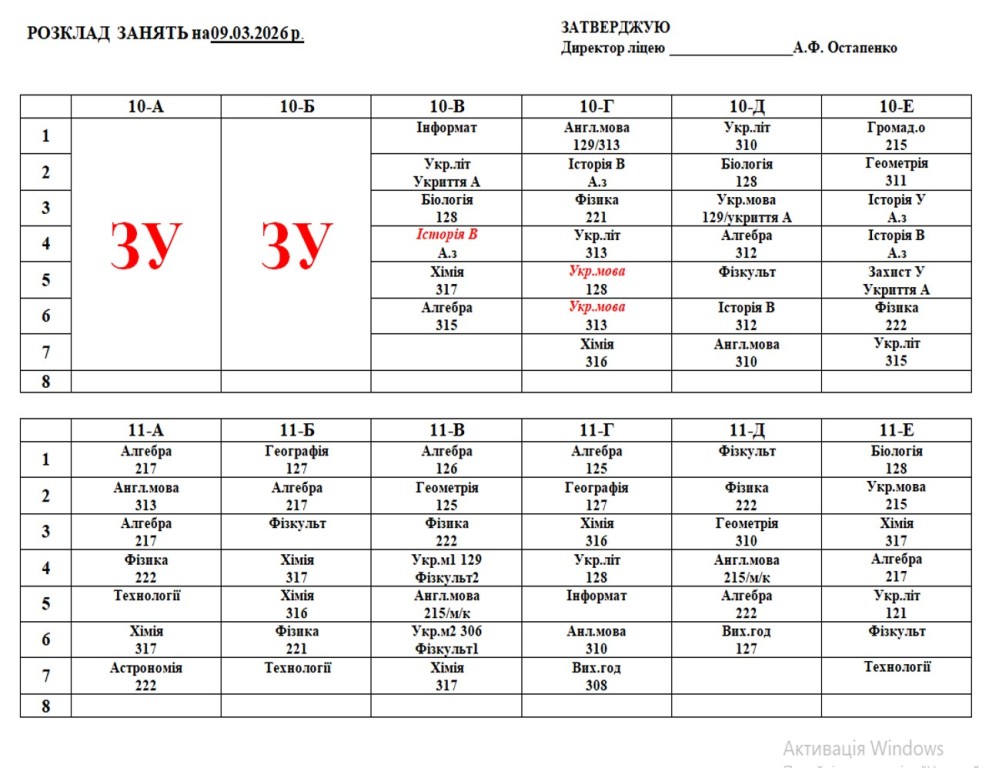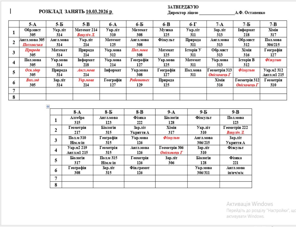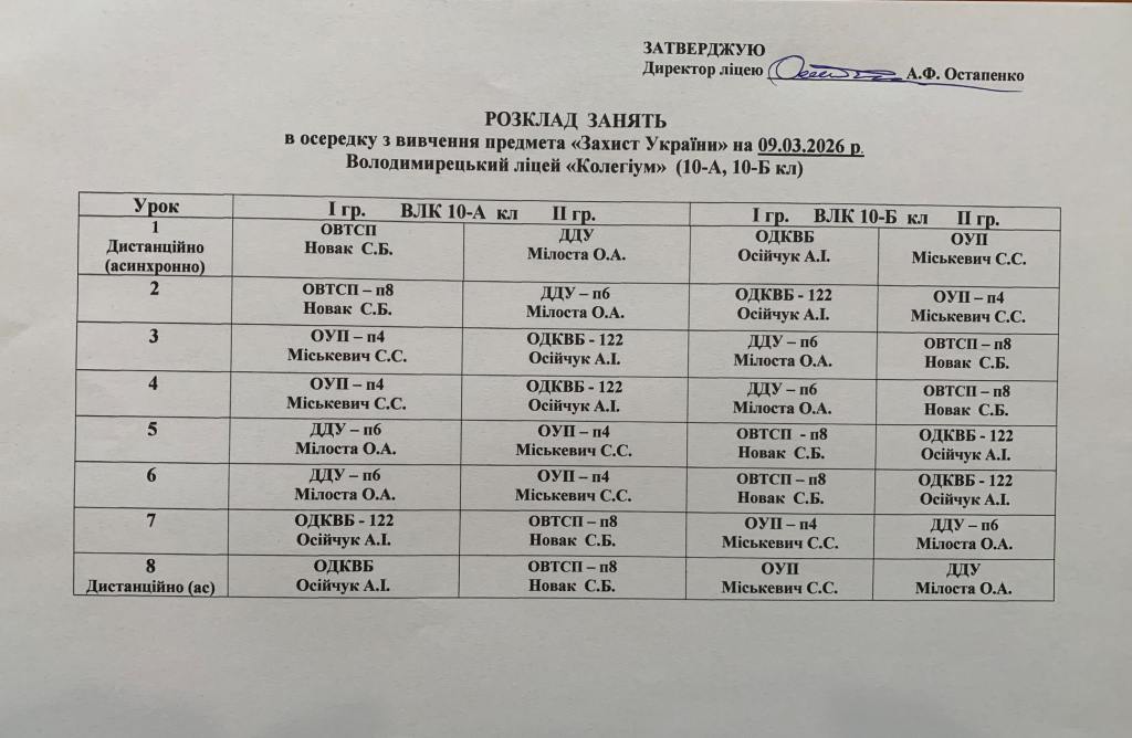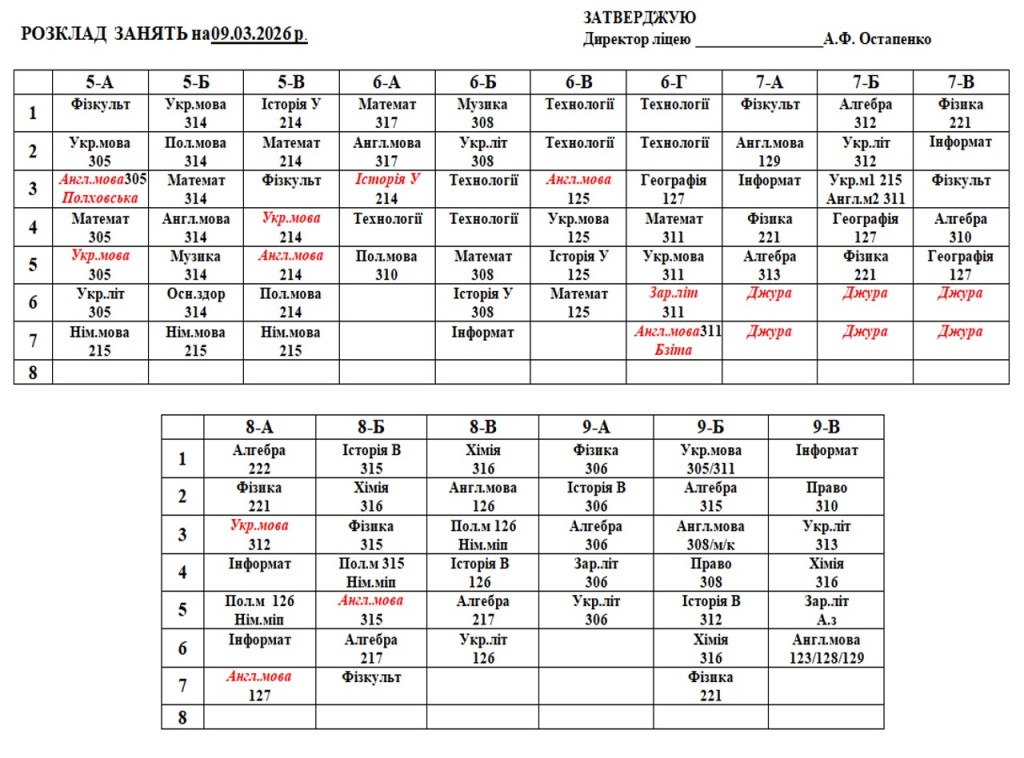 Розклад навчальних занять на 09.03.2026 року