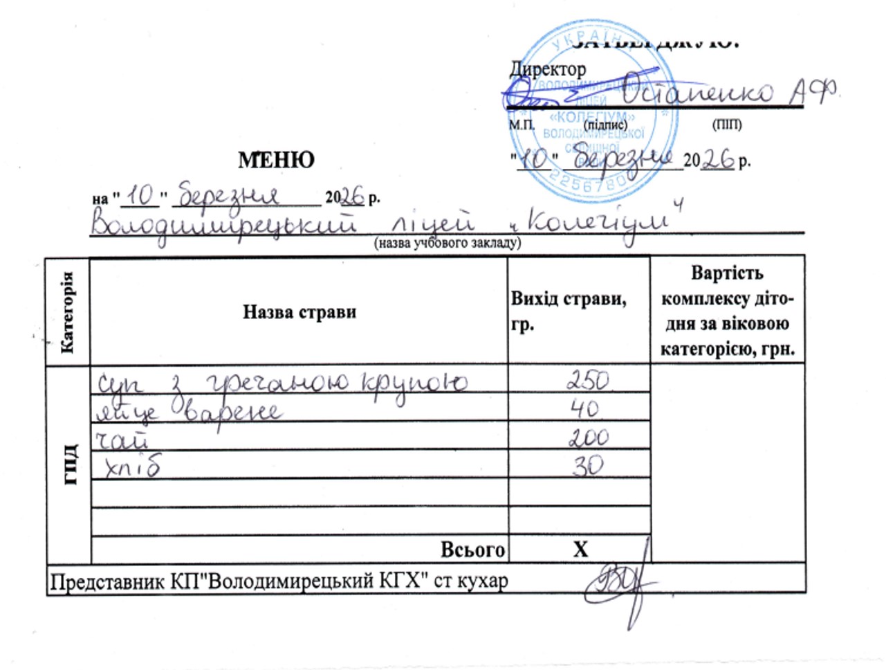 Меню на 09.03.2026 року