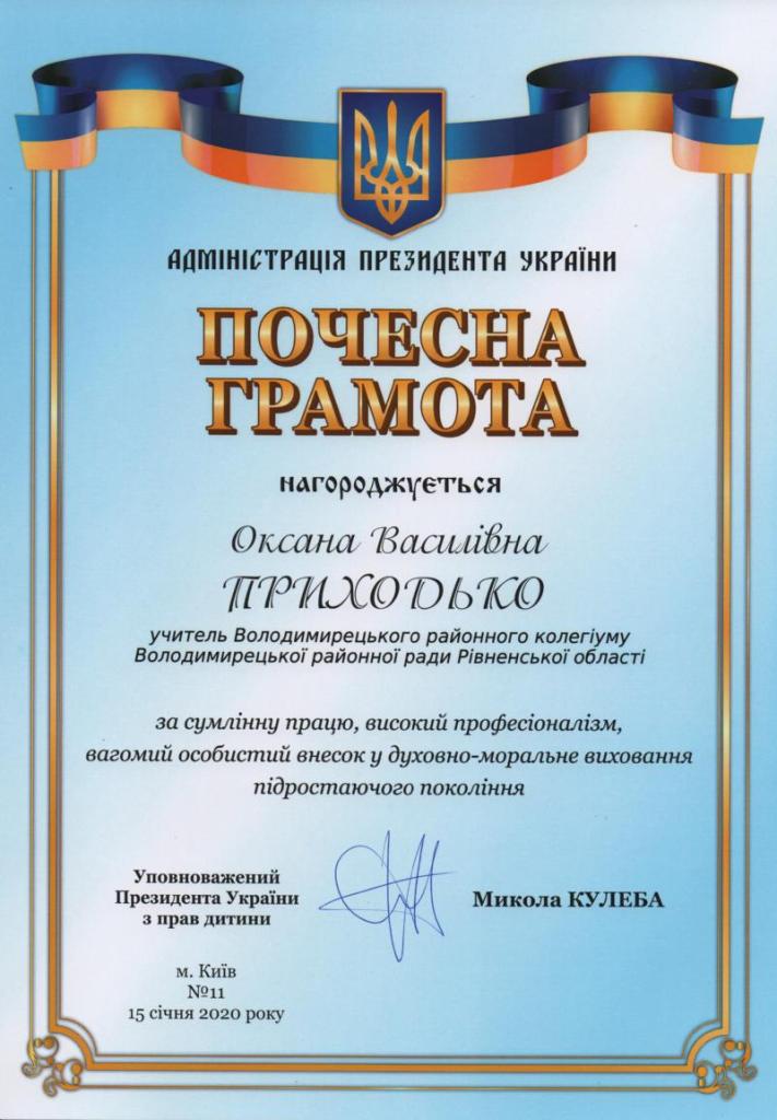 Вчитель християнської етики Приходько О.В., була нагороджена Почесною грамотою Уповноваженого Президента з прав дитини за сумлінну працю, високий професіоналізм, вагомий внесок у духовно-моральне виховання підростаючого покоління.