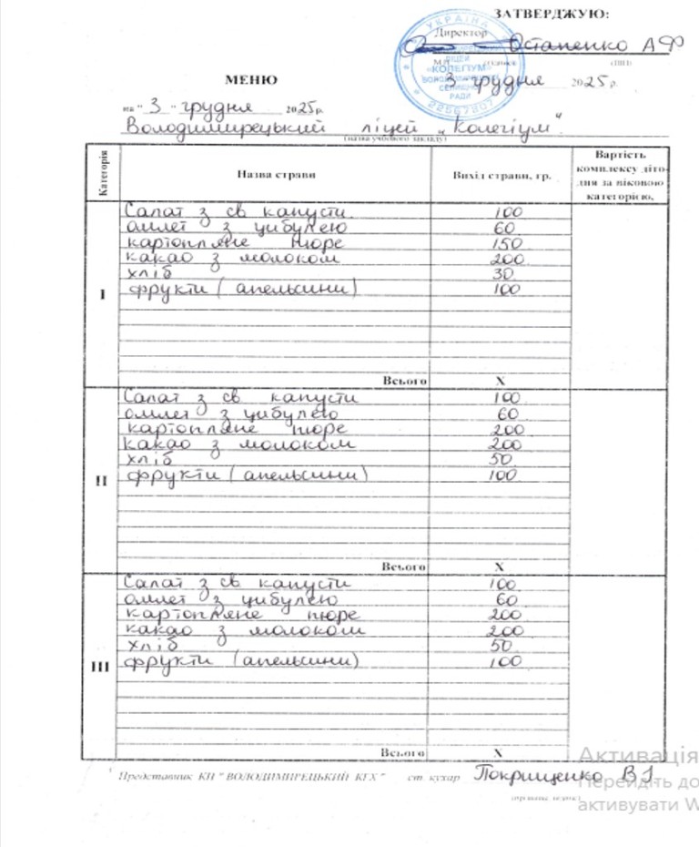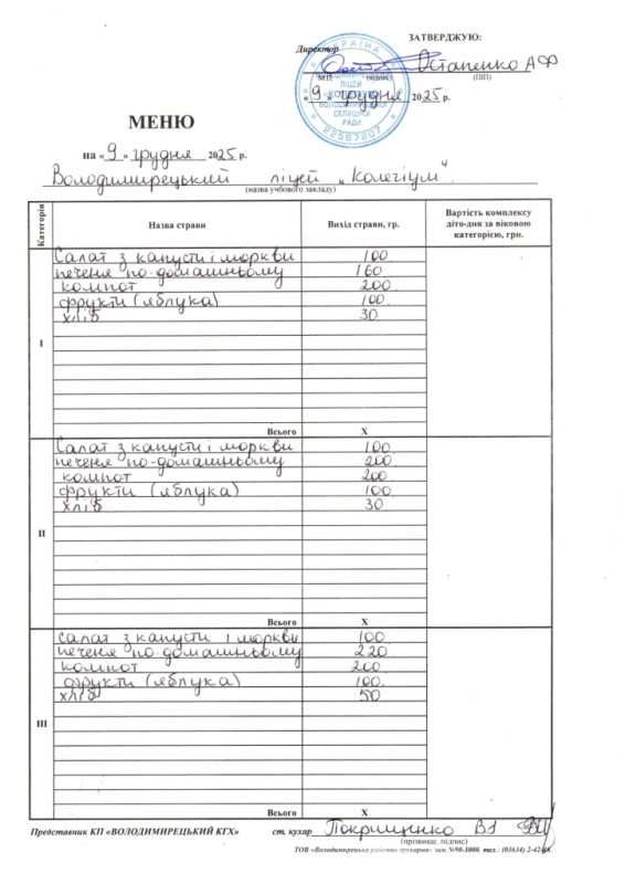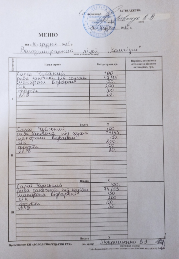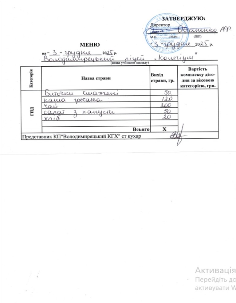 Меню на 03.12.2025 року