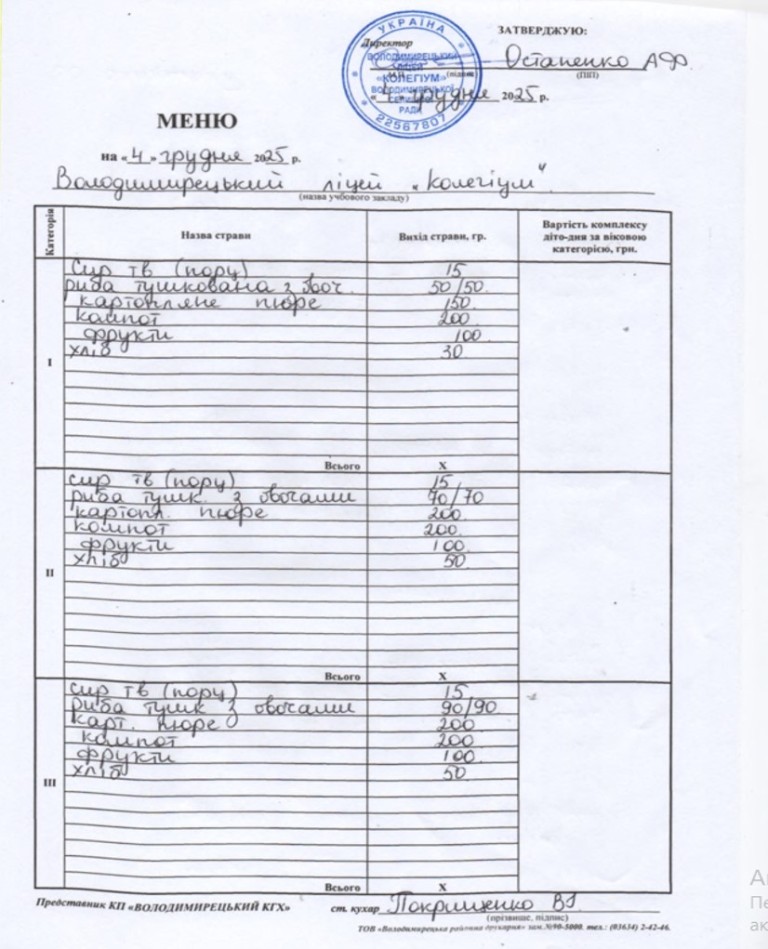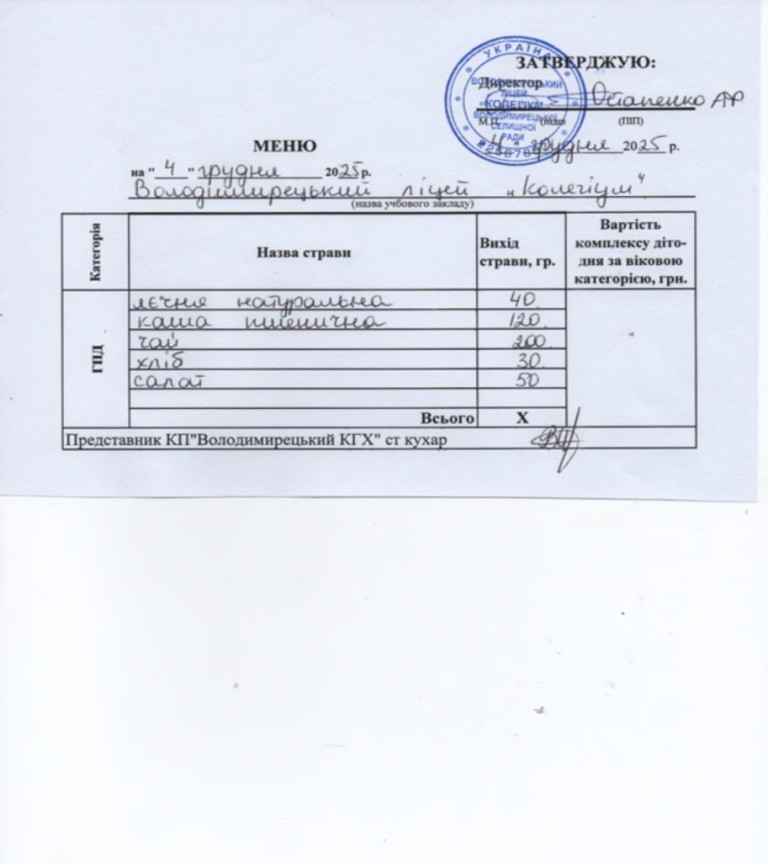 Меню на 04.12.2025 року