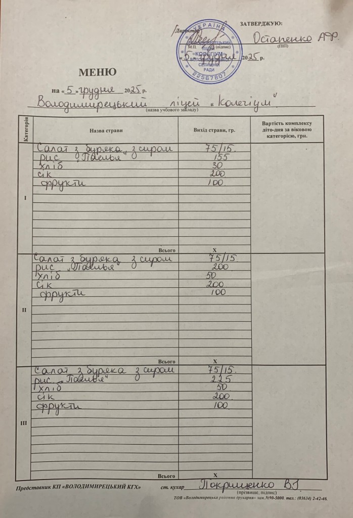 Меню на 05.12.2025 року