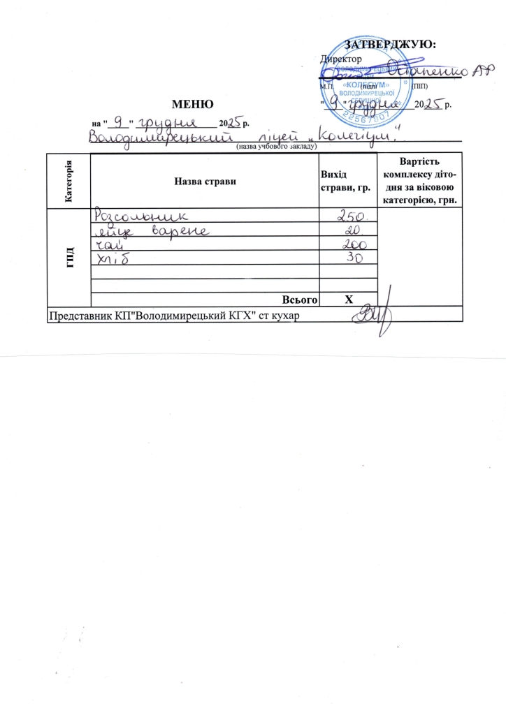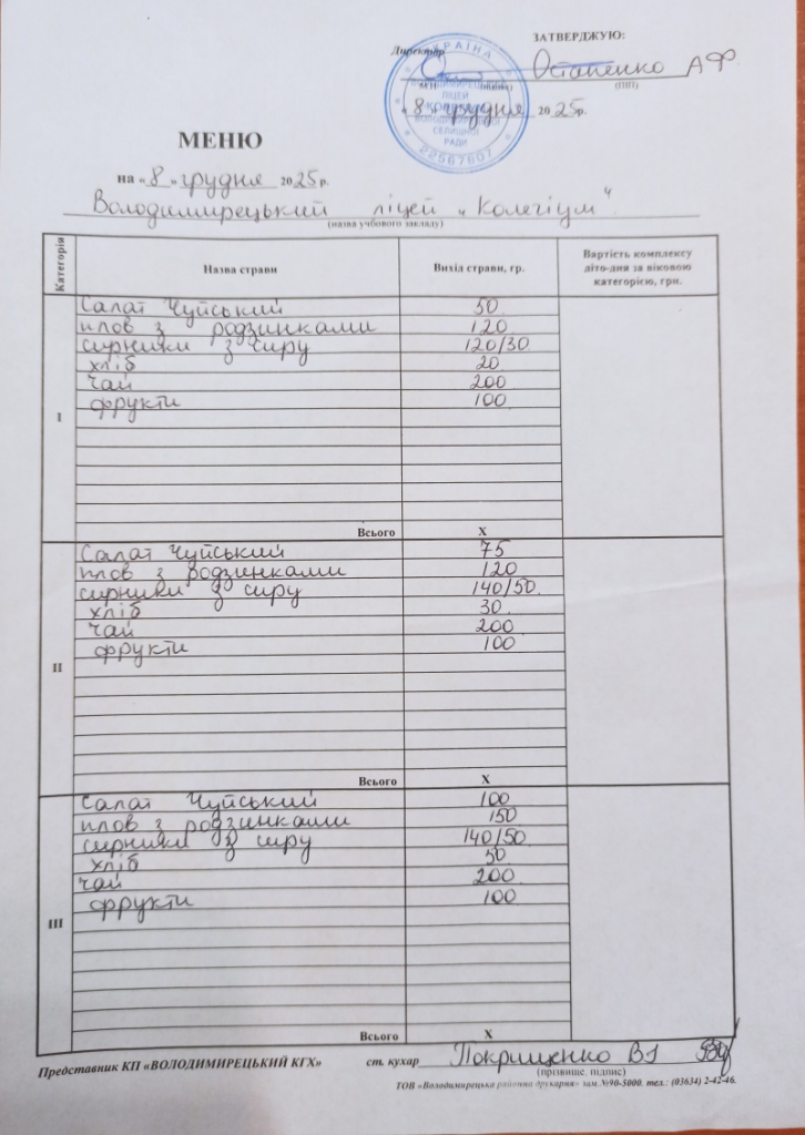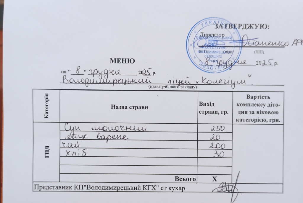 Меню на 08.12.2025 року