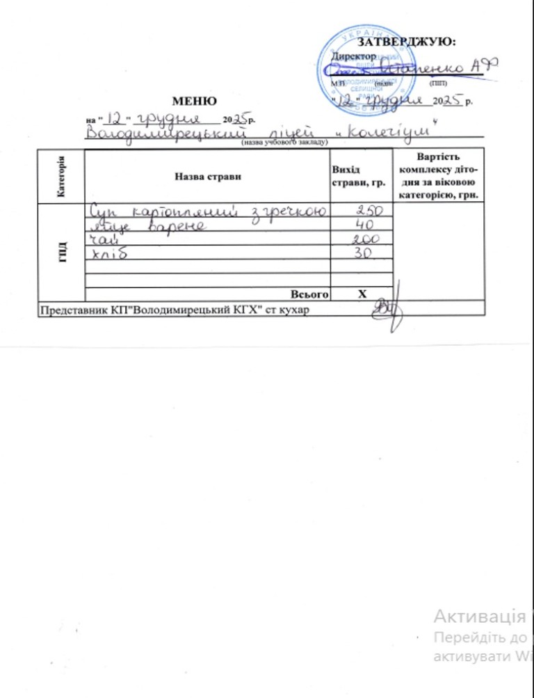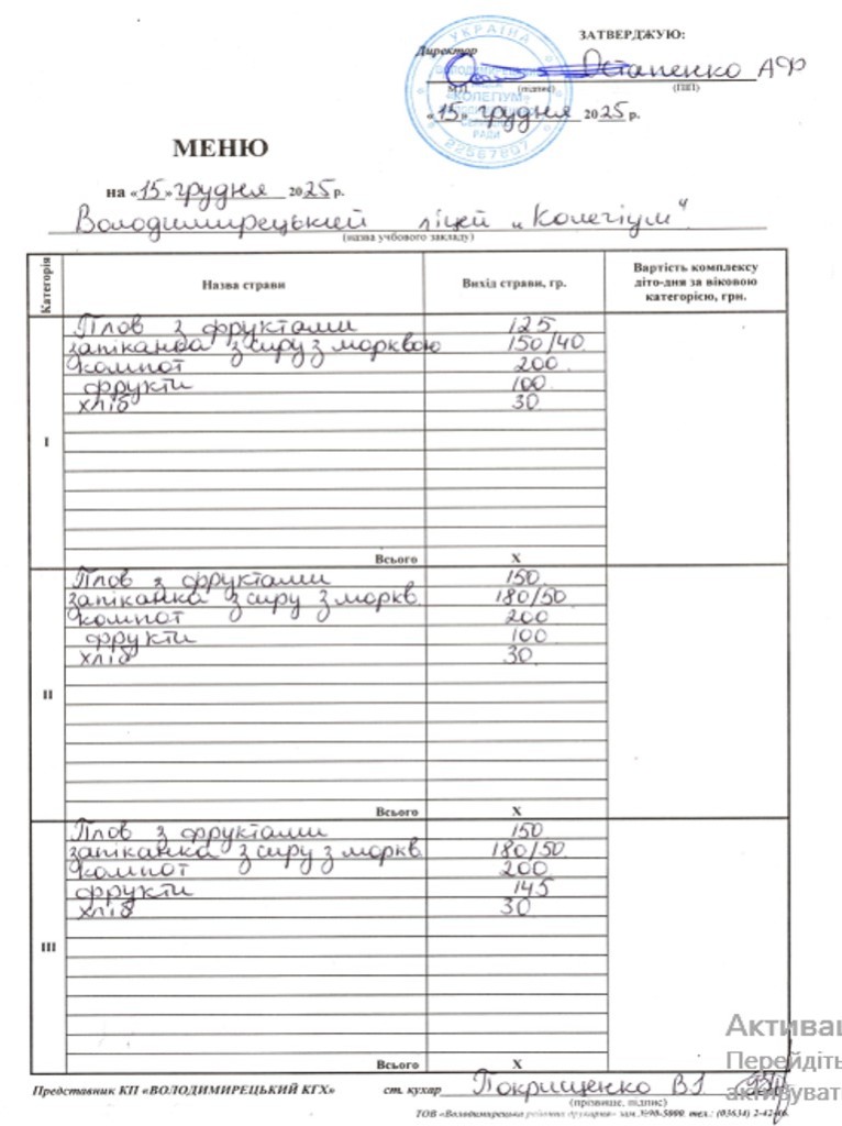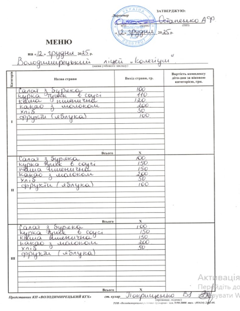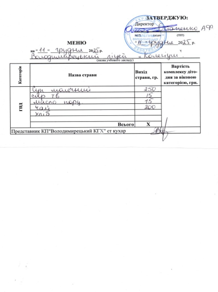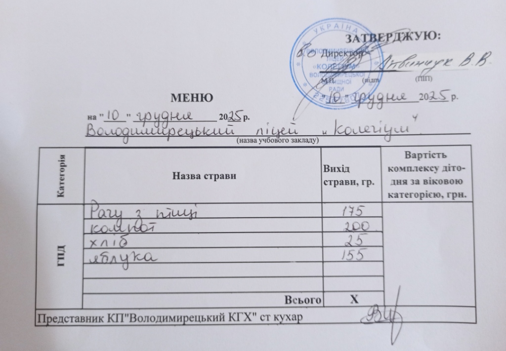 Меню на 11.12.2025 року