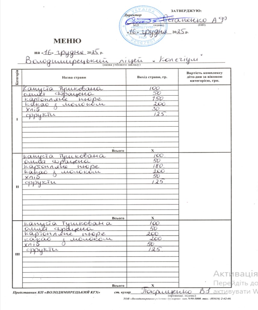 Меню на 16.12.2025 року