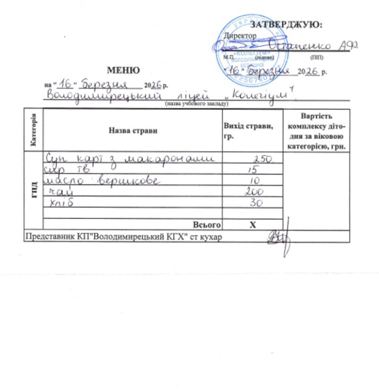 Меню на 16.03.2026 року