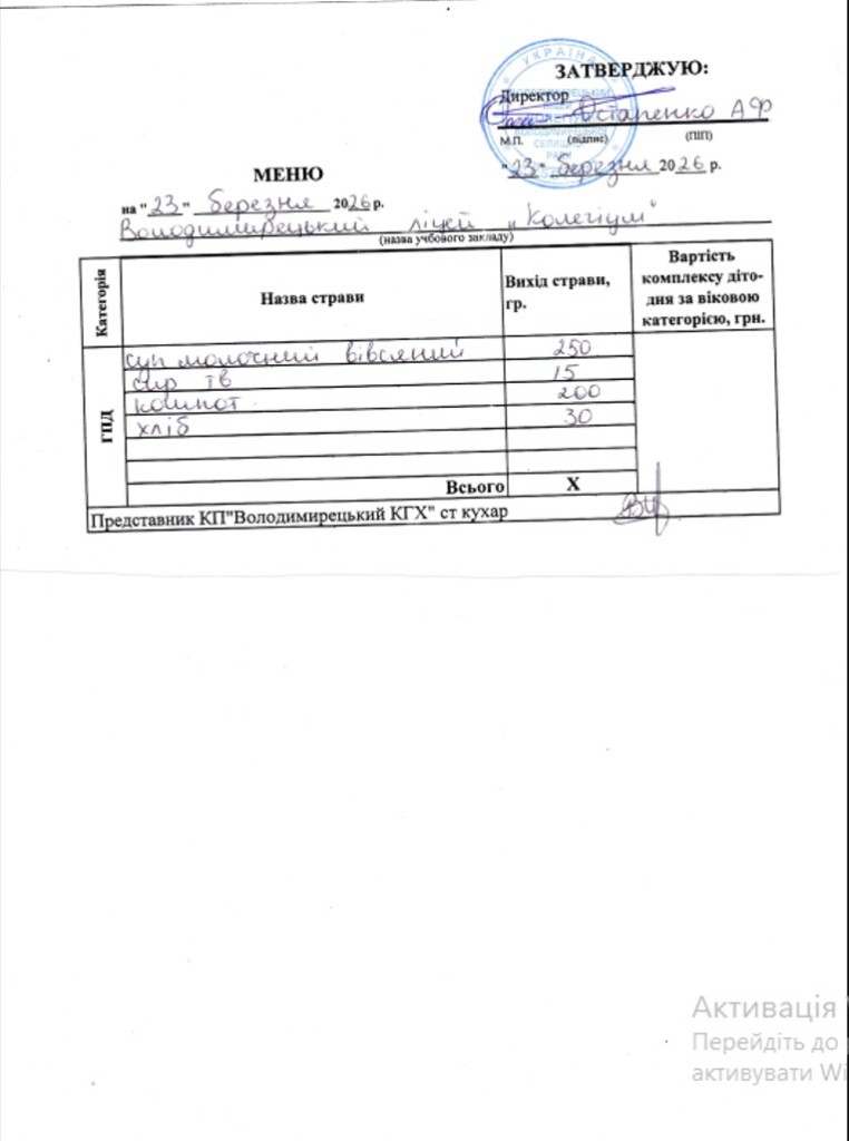 Меню на 23.03.2026 року