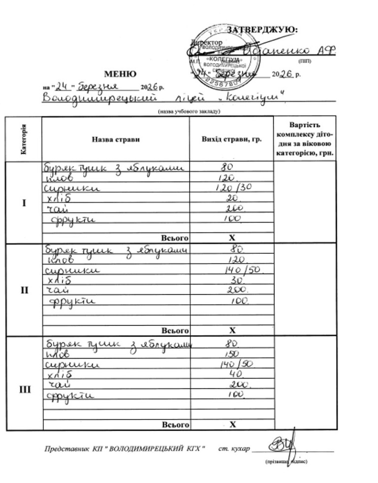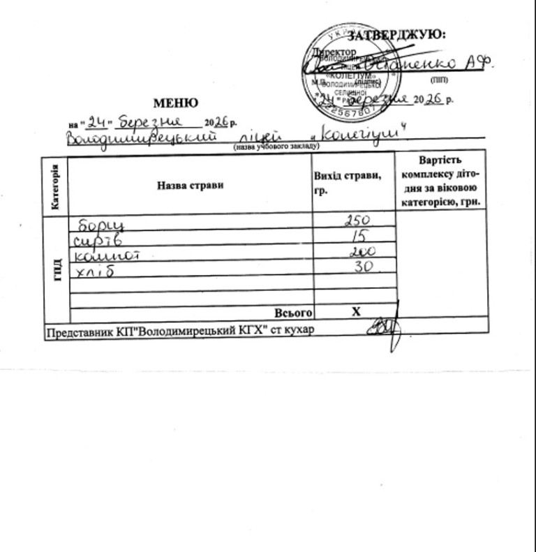 Меню на 24.03.2026 року