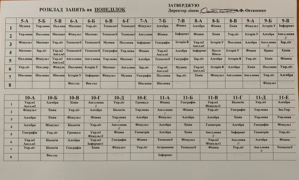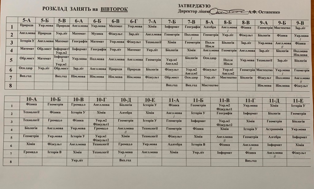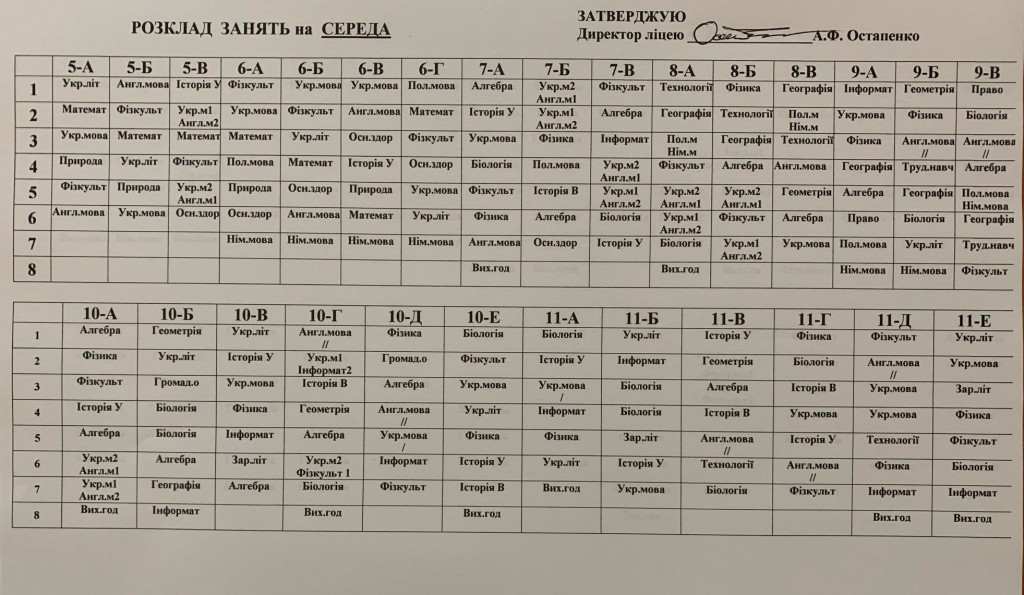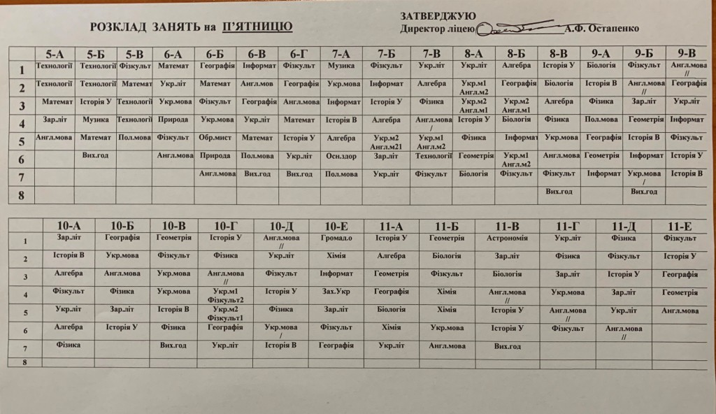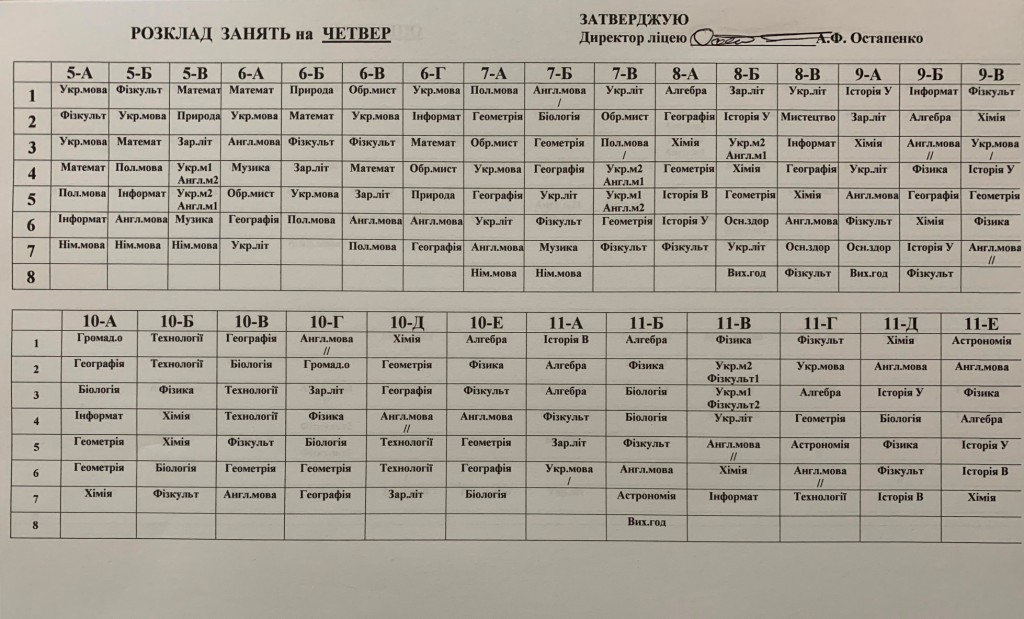 Розклад навчальних занять для учнів 5-11 класів на І семестр 2025-2026 навчального року