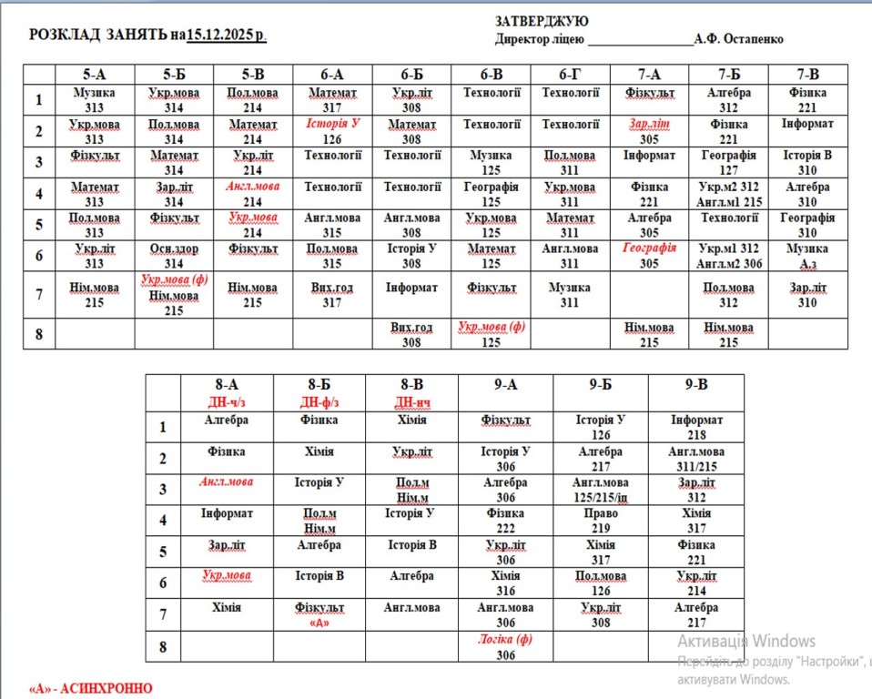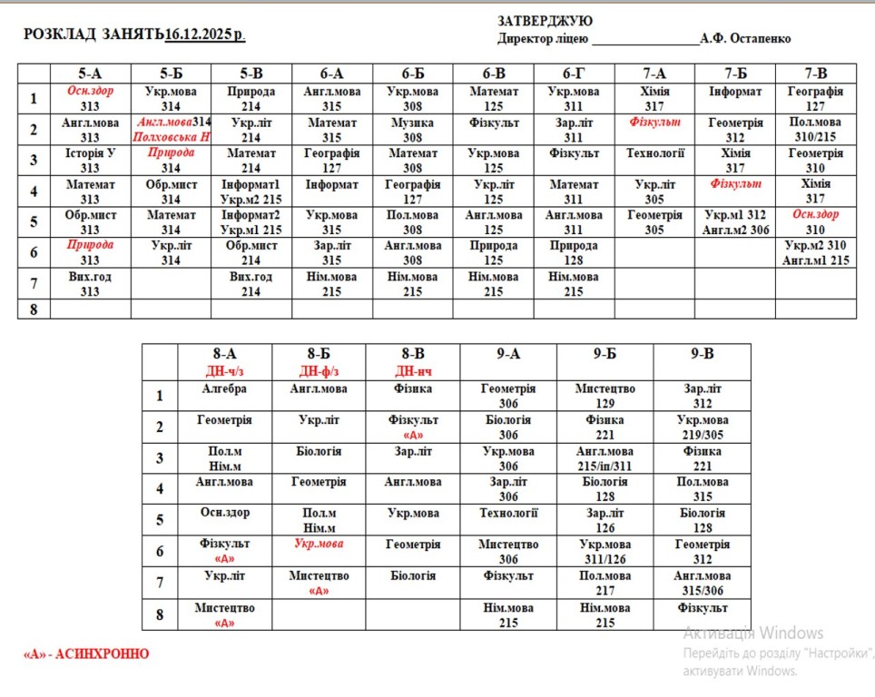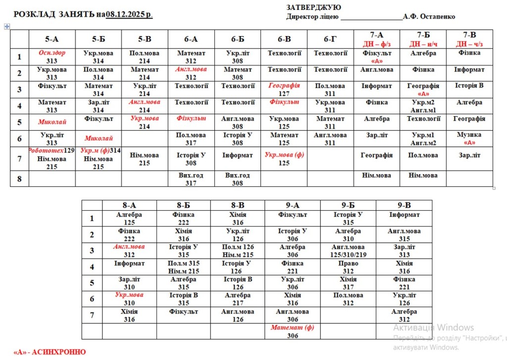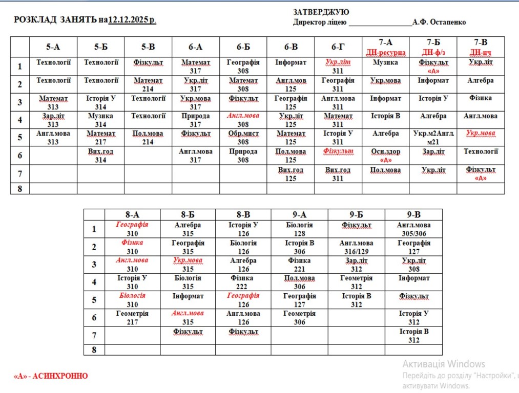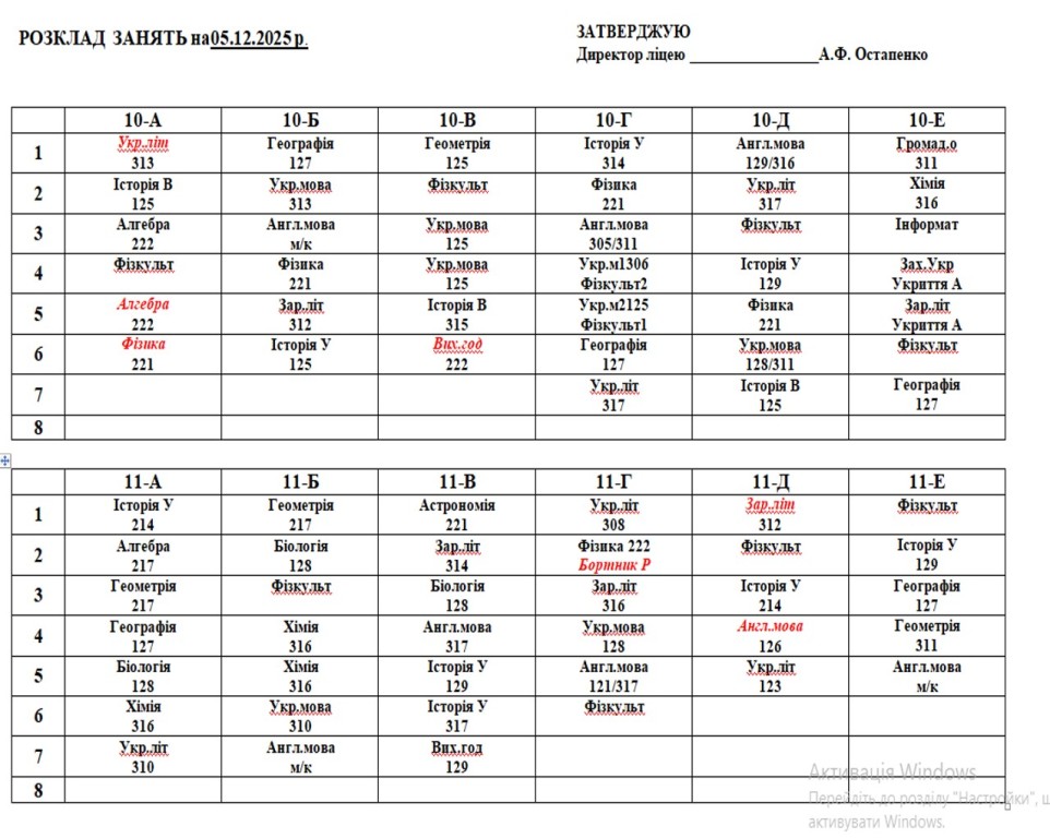 Розклад навчальних занять для учнів 1-11 класів на 05.12.25 року