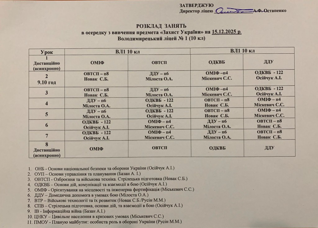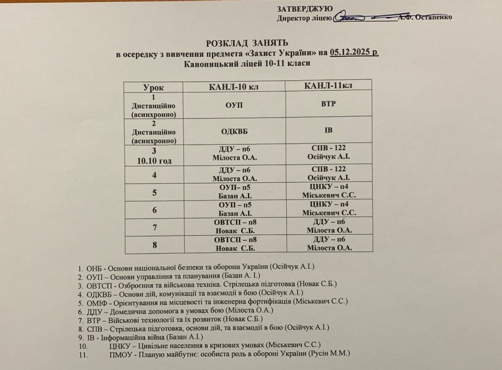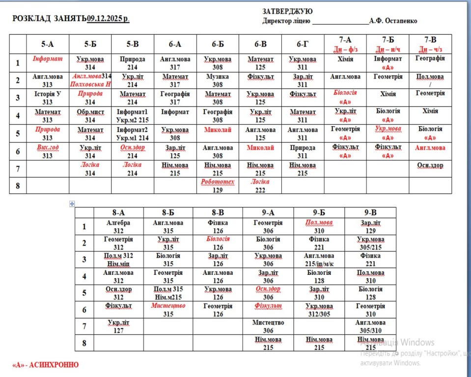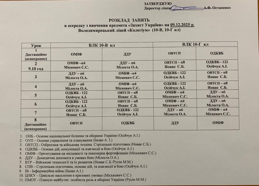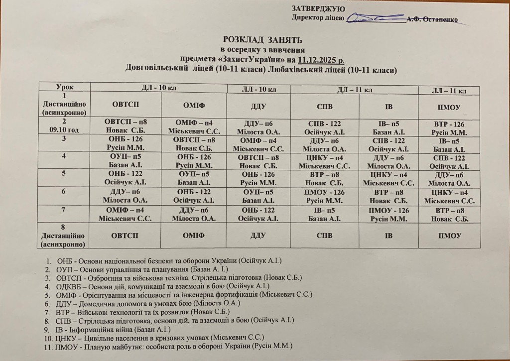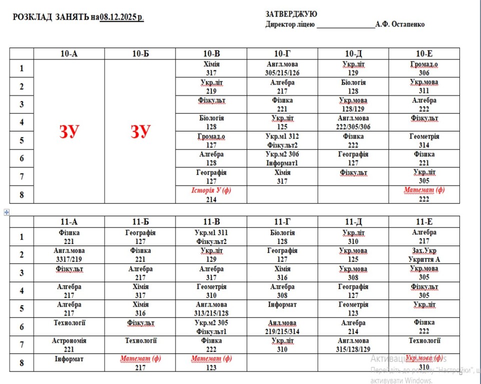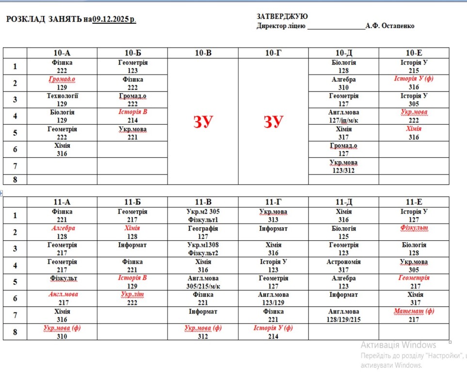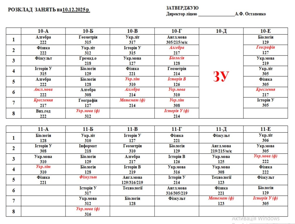 Розклад навчальних занять для учнів 1-11 класів на 10.12.2025 року