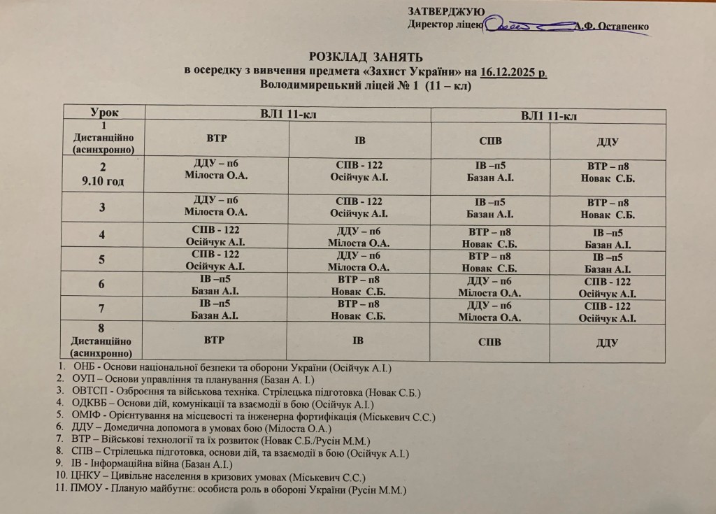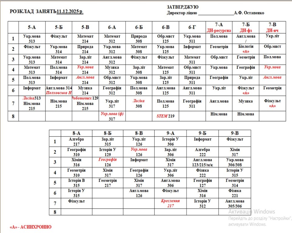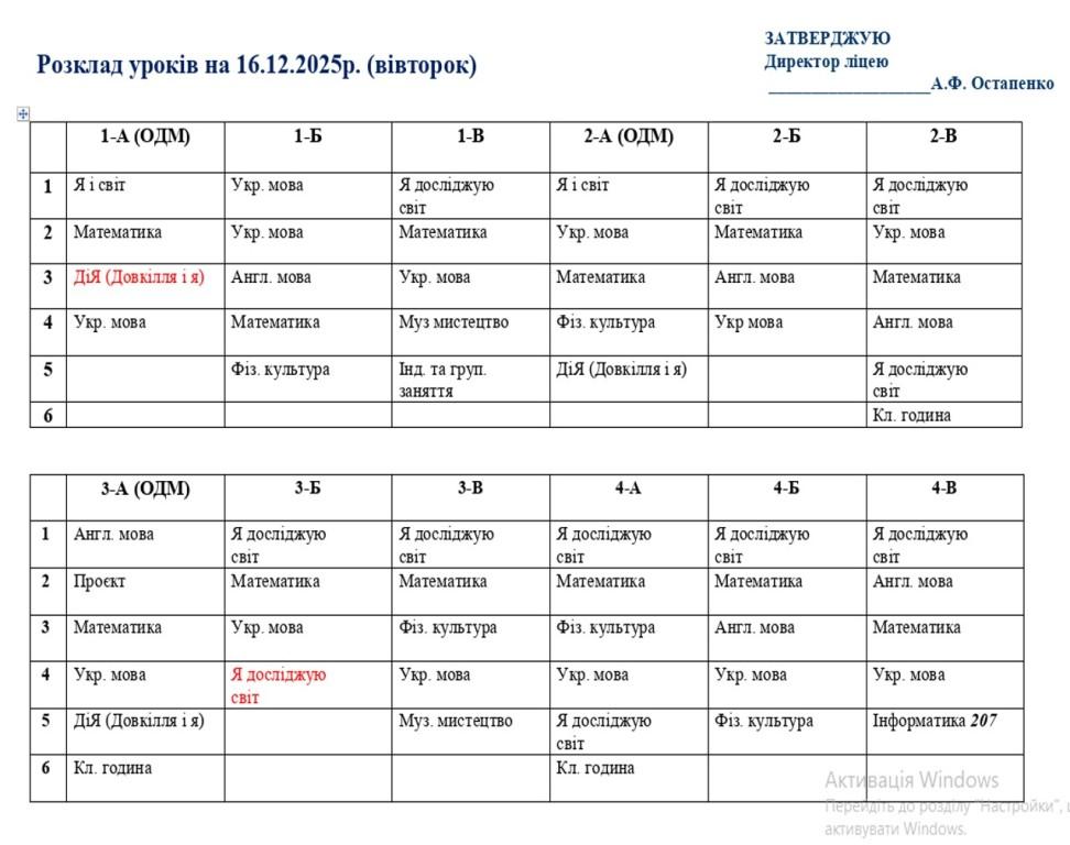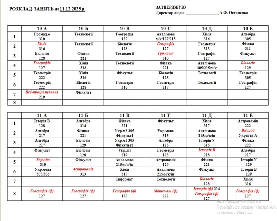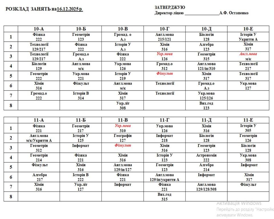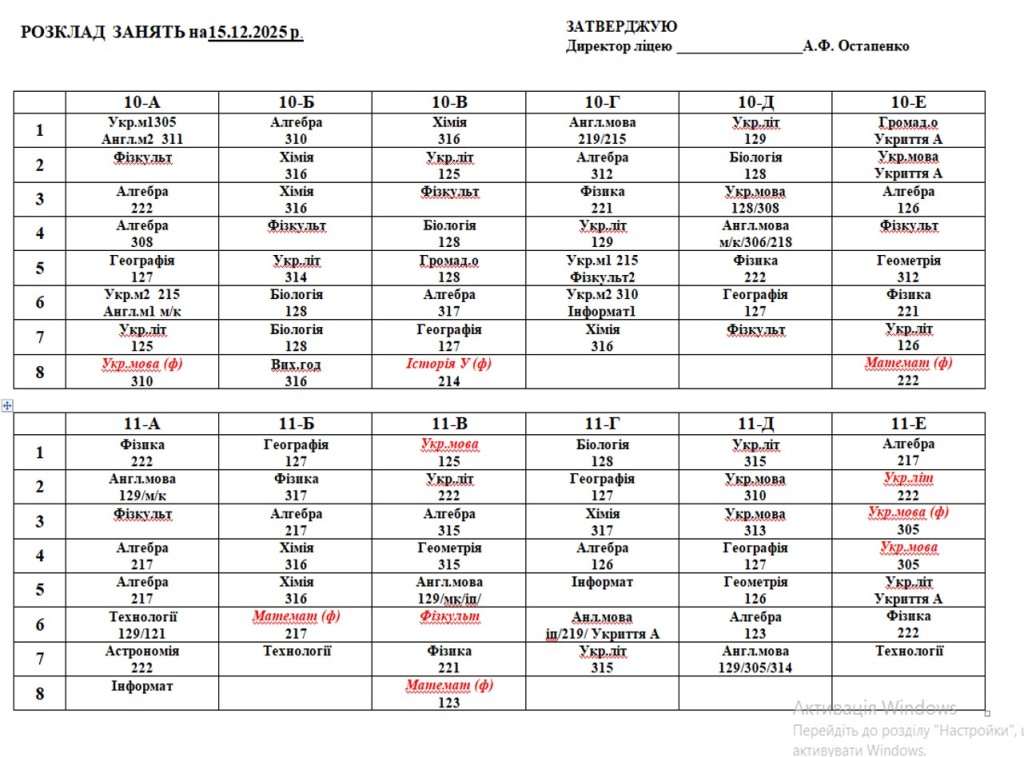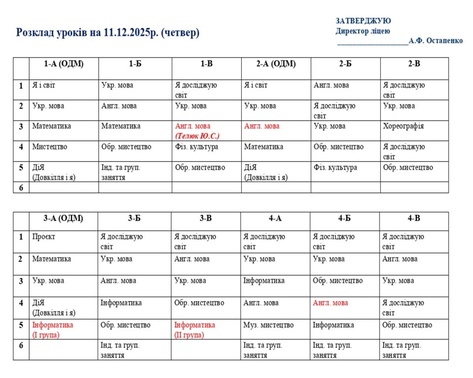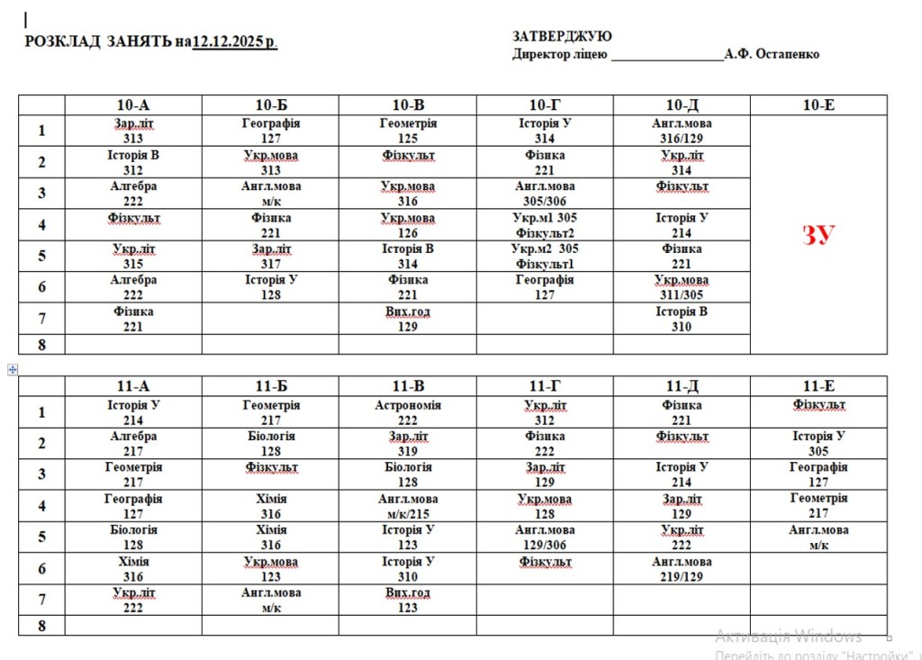 Розклад навчальних занять на 11.12.2025 року для учнів 1-11 класів
