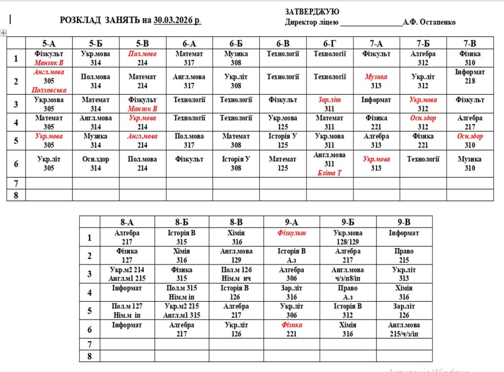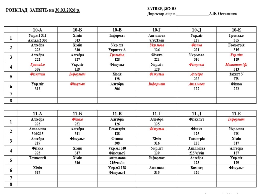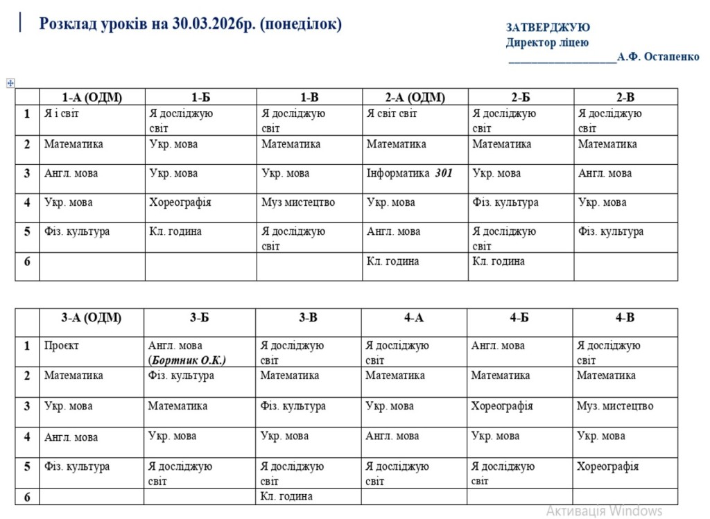 Розклад навчальних занять для унчів 1-11 класів на 30.03.2026 року