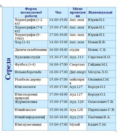 Графік роботи гуртків та секцій