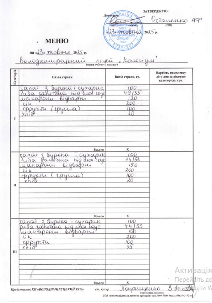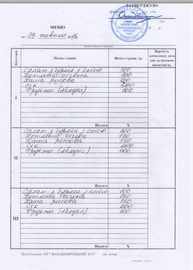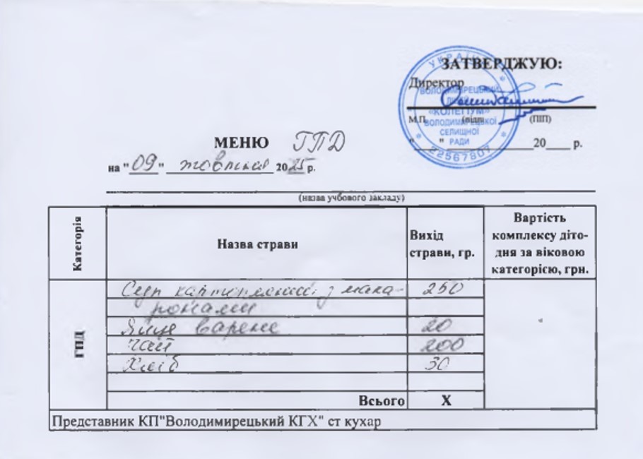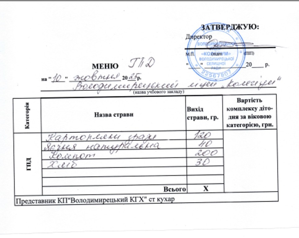 Договір про закупівлю № 1/24 від 05 січня 2024 року між Володимирецьким ліцеєм "Колегіум" Володимирецької селищної ради та Кооперативним підприємством "Володимирецький комбінат громадського харчування".