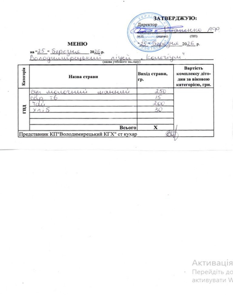 меню на 25.03.2026 року