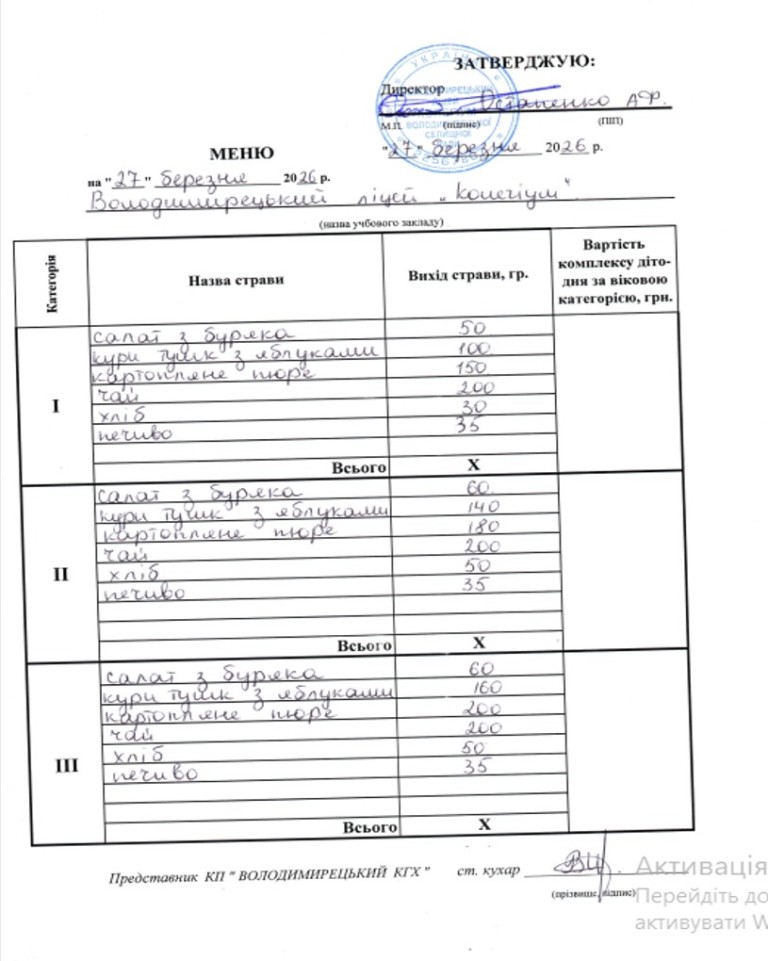 Меню на 27.03.2026 року