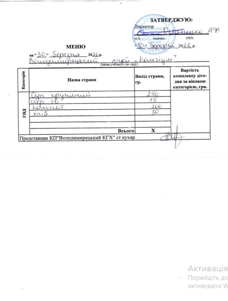 Меню на 30.03.2026 року