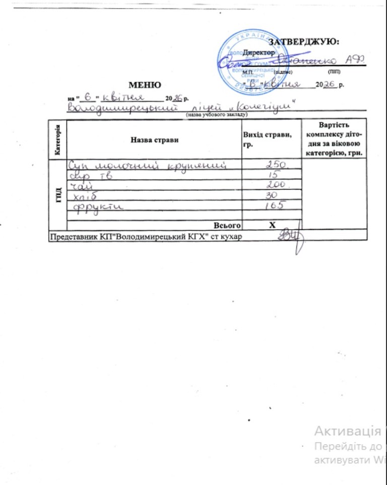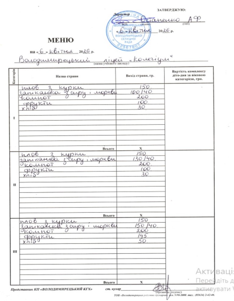 меню на 06.04.2026 року